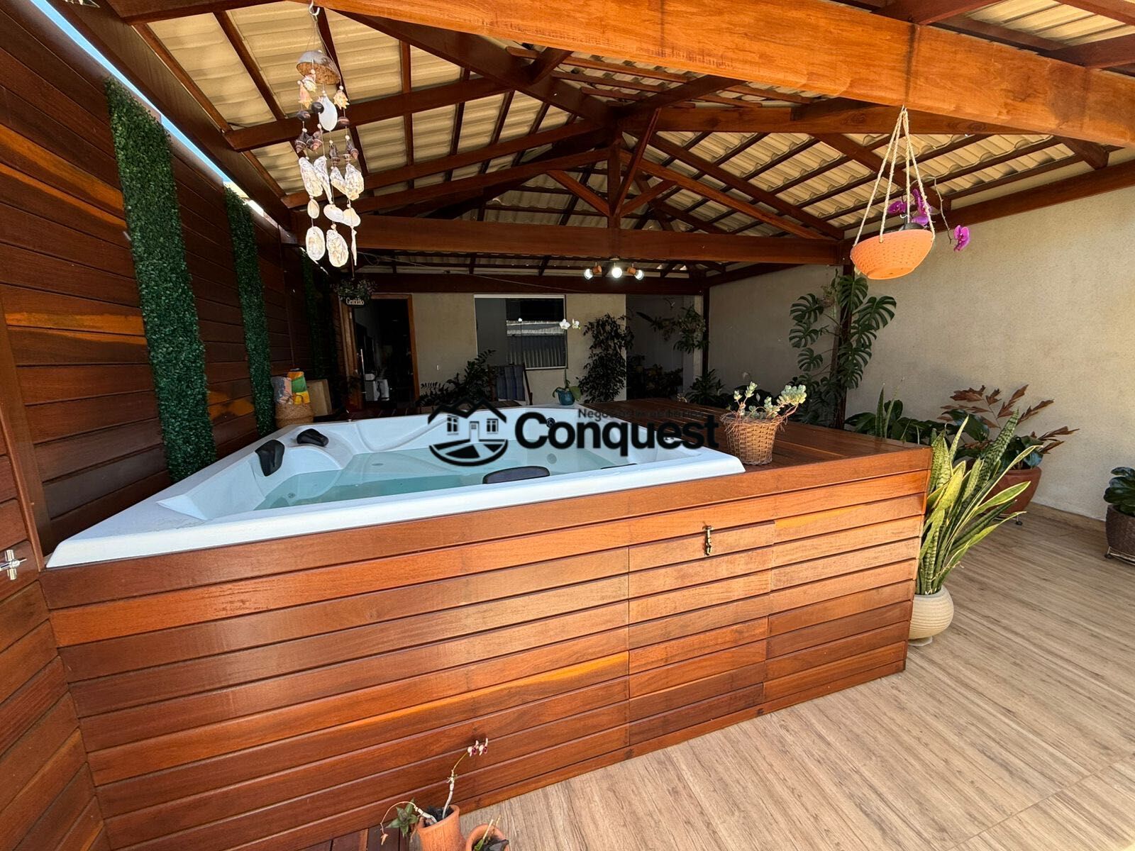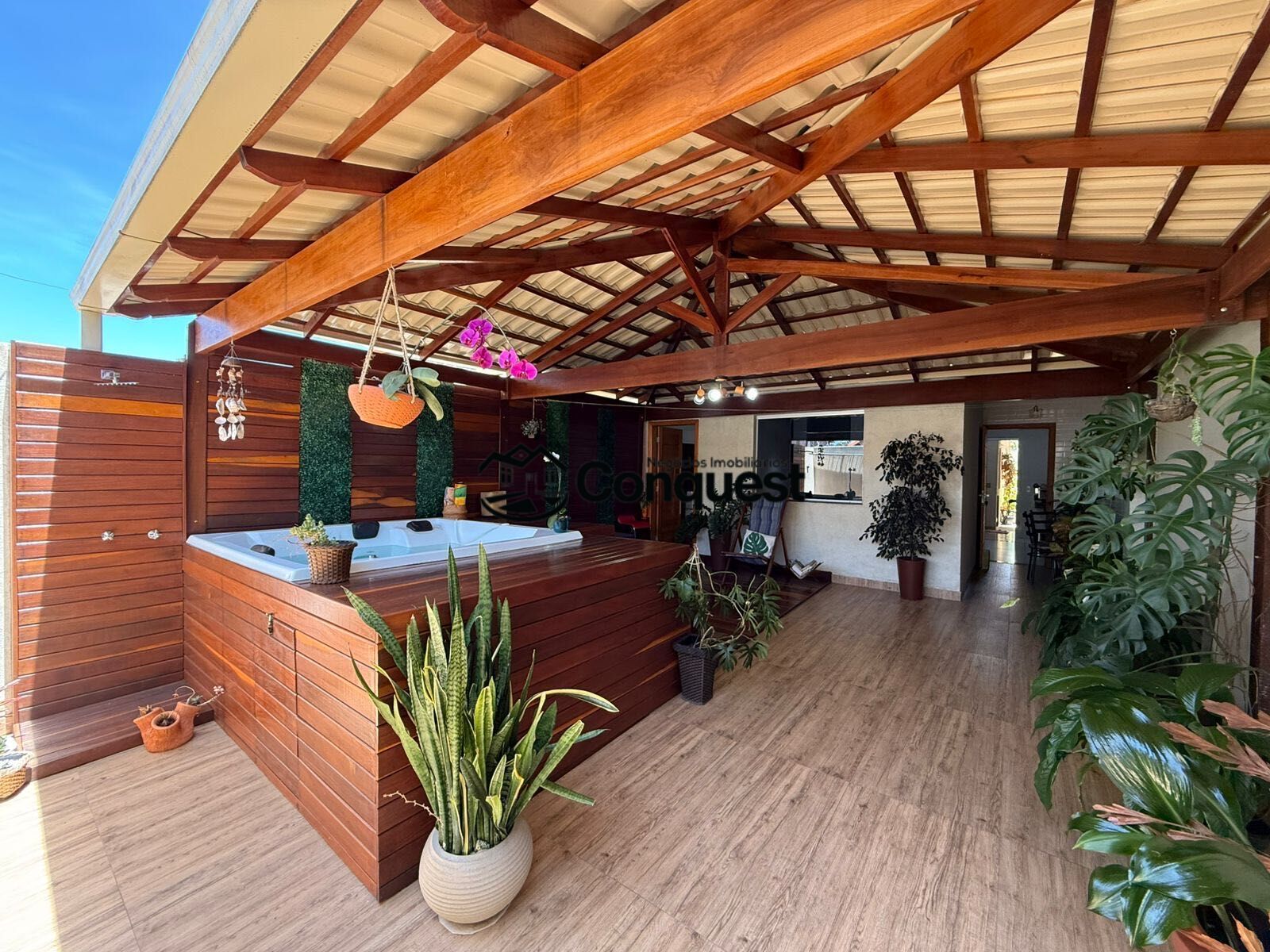 A área é totalmente coberta com telhado colonial, com acabamento em madeira de excelente qualidade, iluminação aconchegante e decoração com plantas naturais.